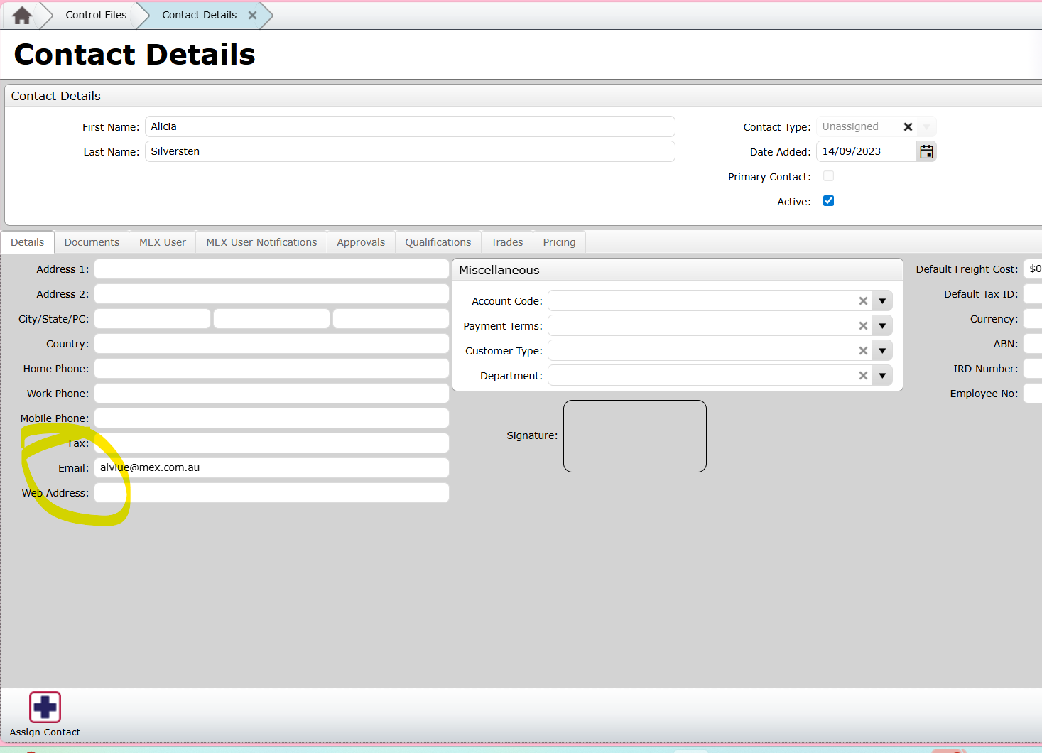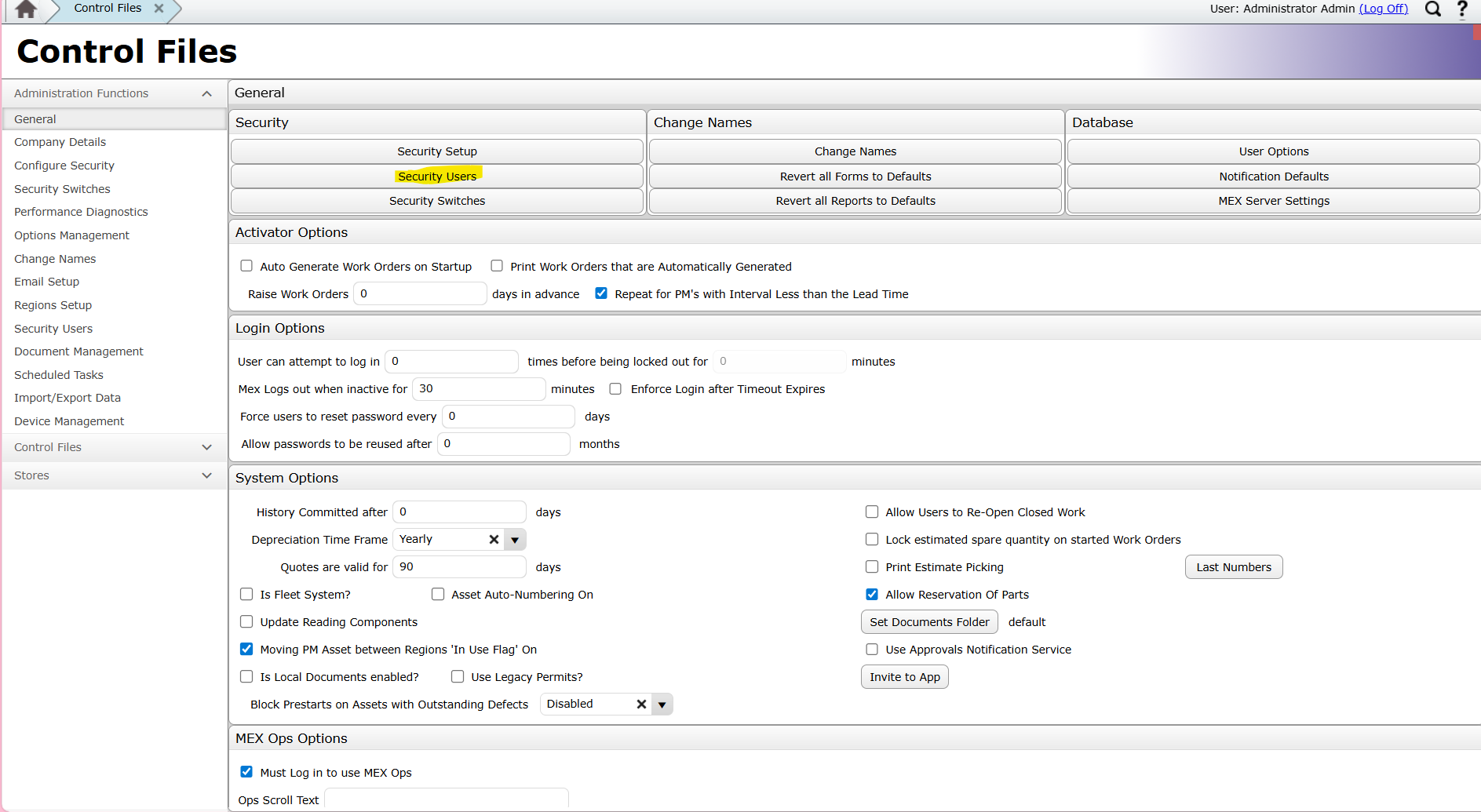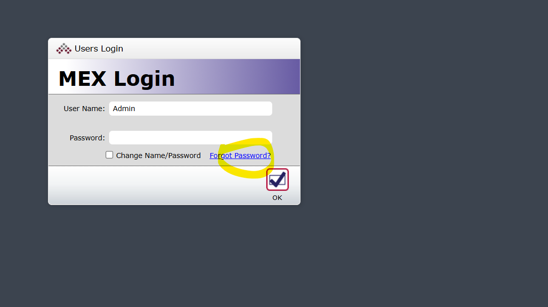Upon entering a user name and selecting the forgot password function, MEX will send an email assigned to the username (in Control Files> Security Users> Details) entered with a prompt to reset the account password. Please note, an email address assigned to the user account is required for this feature to work. An email address can be assigned from the Contact details page referenced above, under the details tab.