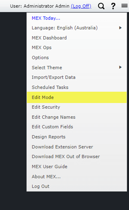 Edit Mode (../../EditMode) is a tool in MEX that allows users to set up security, edit labels, set mandatory fields, view audit logs of changes made to the data in MEX.