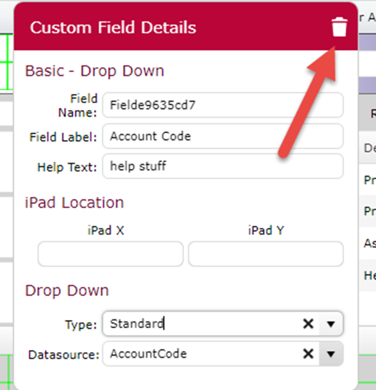 A custom field is removed from the screen by clicking on the rubbish bin icon in the top right-hand corner of the field's details. Note that when you remove a field you are also deleting all of the information that has been entered into that field.