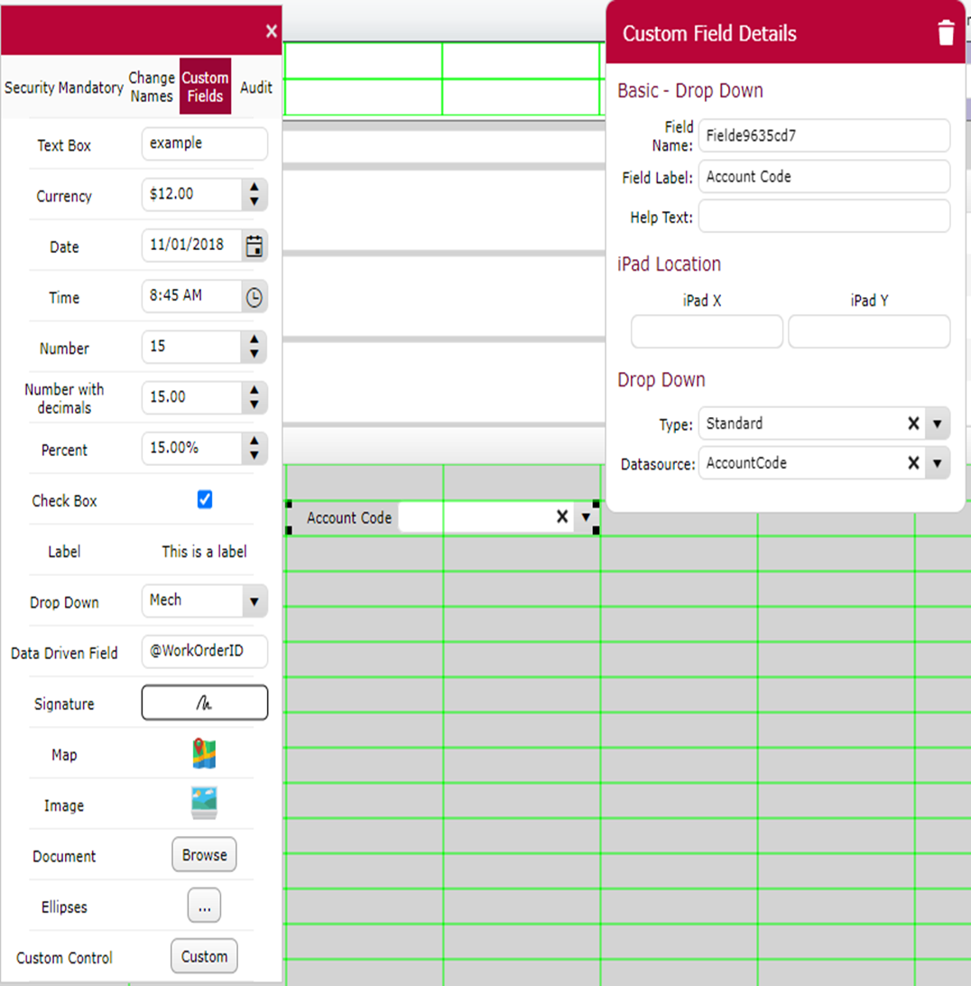 A field is added to the screen by clicking on the appropriate field type in the toolbar and dragging-and- dropping the field onto any position in one of the green grids. Once a field has been dropped onto the grid then a "Custom Field Details" pop-up will be displayed for you to enter the details of your new field into. The type of details that need to be entered for the field will vary depending upon what type of field you are adding.