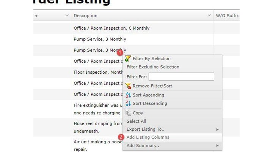 The menu that appears when right clicking a listing (1) – then selecting Add Listing Columns (2)