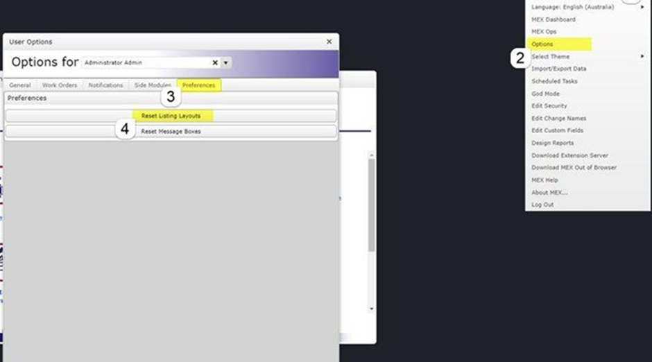 To reset the listing layouts all we need to do is navigate to the main menu and select options from the drop down in the top right-hand side of Mex. From there you select Preferences then ‘Reset Listing Layouts’.