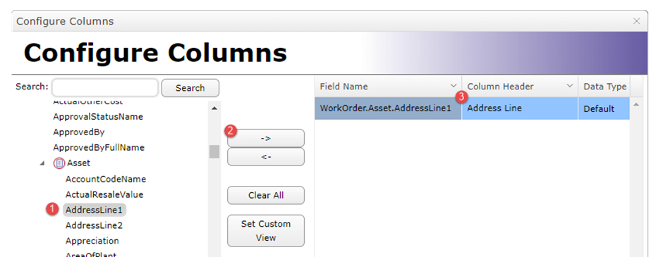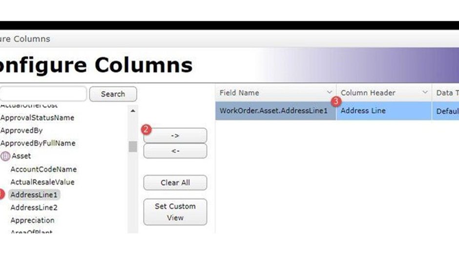 - I then select the "Address Line 1" field from within the Asset and click on the "->" button to add it to the listing.