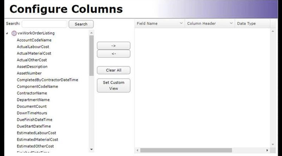 - Each Work Order has a single Asset, so the Asset’s fields can be selected for display in the listing.