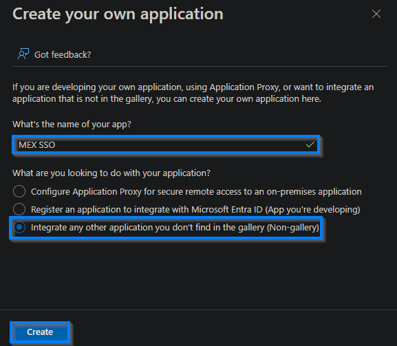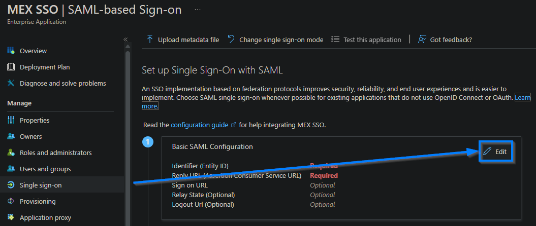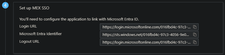 You will need to copy URL addresses from the Microsoft Entra page. Under section 4 'Set up MEX SSO'.