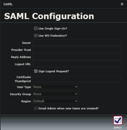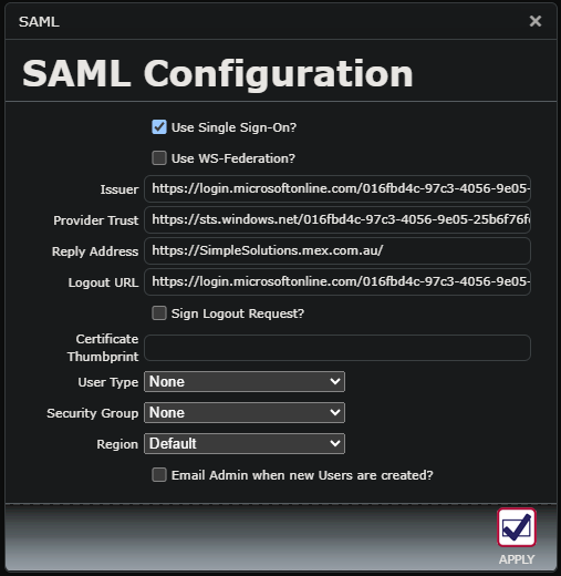 If you only want to save the details and do not want to enable SSO, untick 'Use Single Sign-On?' then click the 'Apply' button. This way you can enable SSO later without having to re-enter the information.