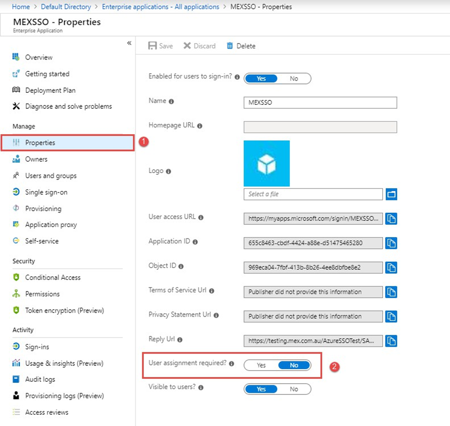 The last action to complete is setting up Azure user’s access to MEX SSO. The options are either to allow all users access, or define which users and groups can access MEX SSO.