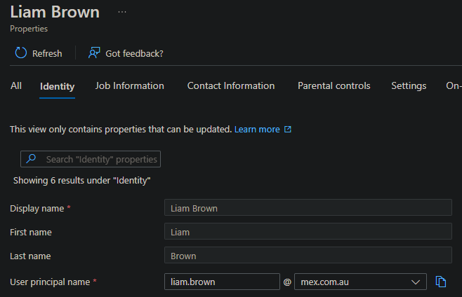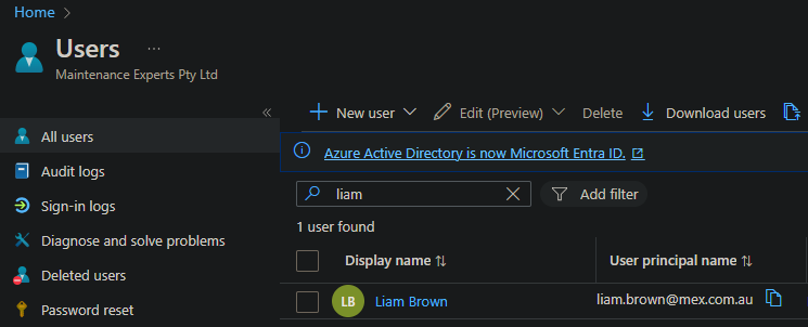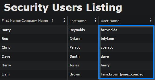 In this example you will see Liam Brown has the username 'liam.brown@mex.com.au' which is the persons company email. However Barry Reynolds has the username 'breynolds' which would not be the persons company email. Barry Reynolds would need to have their account's username changed, this can be done by double clicking their name in the listing.