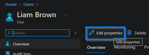 On the top navigation bar search 'Users'. Then on the Users page, search a user and open that user. Once you are on the users page, click the top 'Edit properties' button.