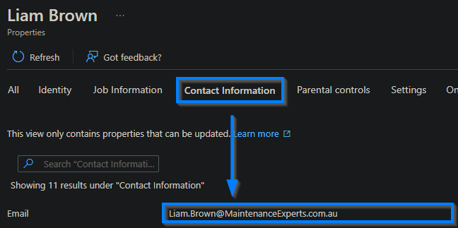 Click on the 'Contact Information' tab. Check if there is an alternative field to use instead of the User principal name. In this example you will see the the email is different from the User principal name.