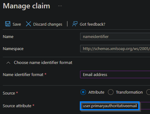 Then back on the 'Manage claim' page, you would set the 'Source attribute' value to 'User.PrimaryAuthoritativeEmail'. Then click the top 'Save' button.