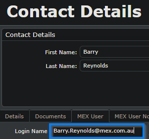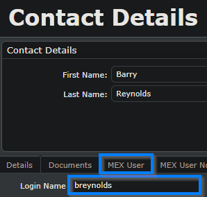 This will open the 'Contact Details' page. Click on the 'MEX User' tab, then see the 'Login Name' field, please note this is the 'Username' field.