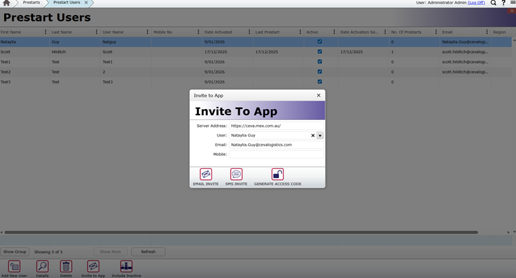 To invite them to the app, login as a full user and head to either the Security Users Listing in Control Files, or click on ‘Users’ in the Prestarts desktop side module. Both will open a listing of relevant users. and pressing the ‘Invite to App’ button and you can email or text users directly as long are they set up as MEX Users (please see 'Creating a New User in MEX 15' Guide here on Knowledgebase if you haven't set them up yet):