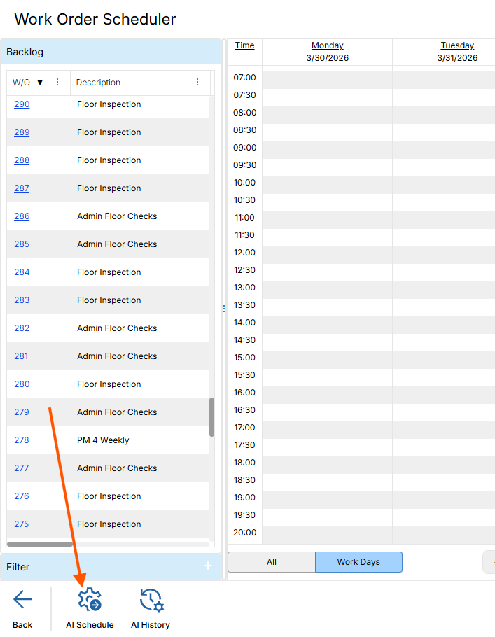 To use the AI Schedule function, you can do so by clicking the AI Schedule Button located in the bottom left of the Work Order Scheduler.