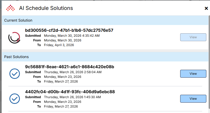 Once this option has been selected, the AI Schedule Solution will pop-up and the schedule will begin to process and propose a solution. Once the Solution is generated, you will be able to select View to inspect the results. You may also view historical schedules that have been set up by the AI, by clicking the AI History button located in the bottom left of the scheduler.