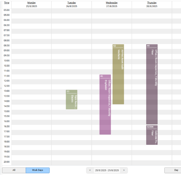 The Schedule periods can be automatically filled by using the AI Schedule function. This function will schedule out the work orders out automatically based on the due start and due finished dates of the work orders in the backlog, as well as taking any pre-existing trade lines into consideration.