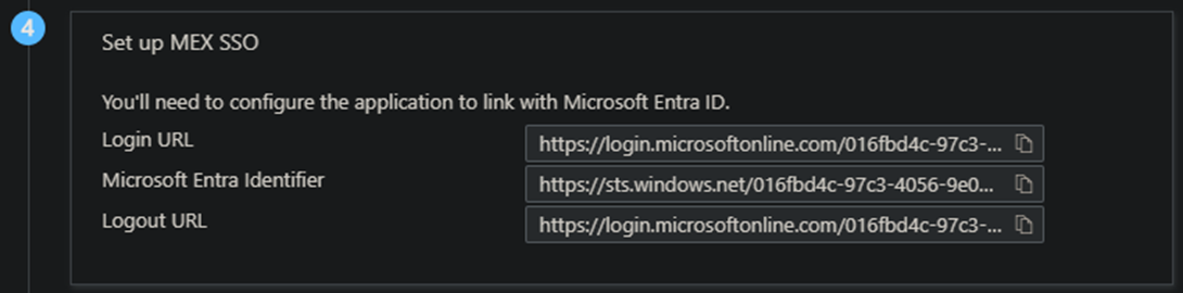 Include the 'Login URL', 'Microsoft Entra Identifier’, and 'Logout URL' Under Set up MEX SSO.